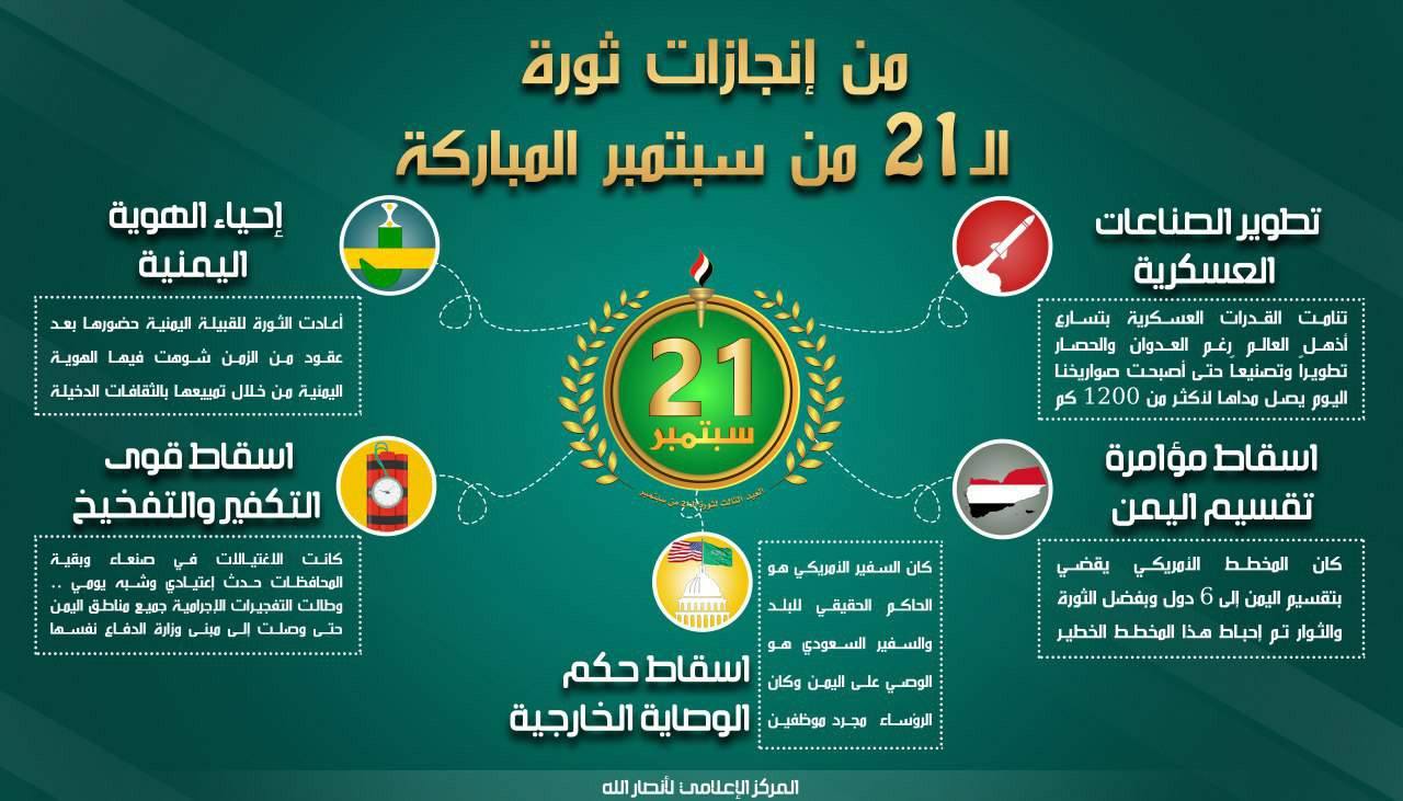 وتحقق لليمن وشعب اليمن بنجاح الثورة صباحية يوم الـ 21 من سبتمبر وسقوط قوى النفوذ التي كانت مسيطرةً على المشهد السياسي والميداني، المنجزات التالية :