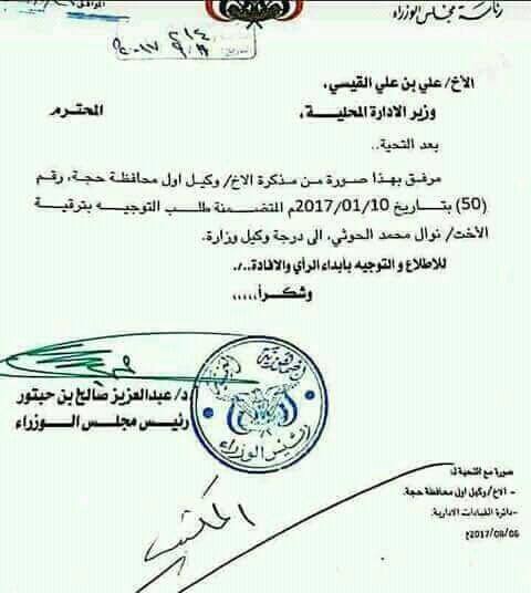 ضمن مسلسل التشويه الذي يستهدف أنصارالله ، تداولت عدد من الوسائل الإعلامية التابعة للعدوان ومرتزقته والطابور الخامس وثيقة مزوّرة على أنها لقرار صادر عن رئاسة مجلس الوزراء بترقية إبنة رئيس اللجنة الثورية العليا محمد على الحوثي إلى درجة وكيل وزارة.
