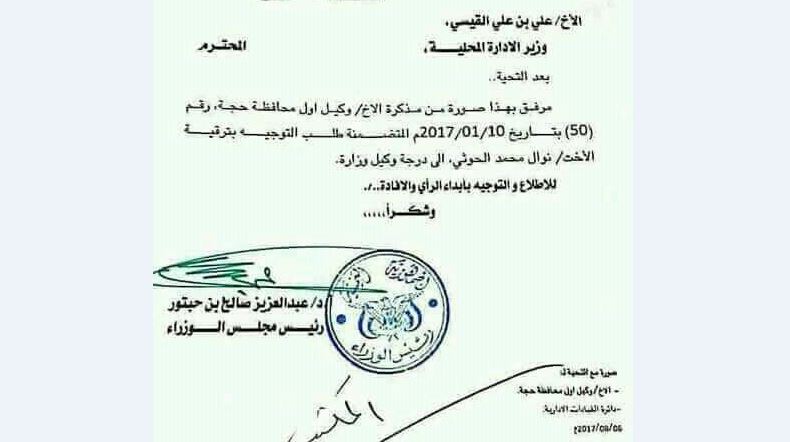 ضمن مسلسل التشويه الذي يستهدف أنصارالله ، تداولت عدد من الوسائل الإعلامية التابعة للعدوان ومرتزقته والطابور الخامس وثيقة مزوّرة على أنها لقرار صادر عن رئاسة مجلس الوزراء بترقية إبنة رئيس اللجنة الثورية العليا محمد على الحوثي إلى درجة وكيل وزارة.