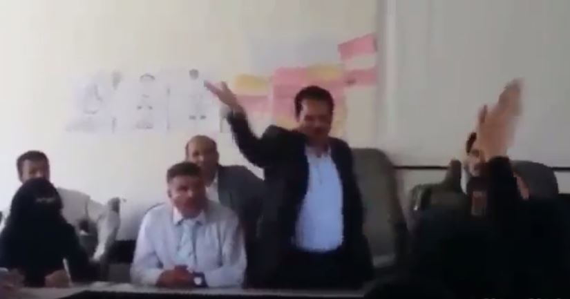 تداول ناشطون على مواقع التواصل الاجتماعي مقطع فيديو مسرب من اجتماع سري لقيادات تربوية تابعة لحزب المؤتمر الشعبي العام، برئاسة مدير منطقة معين التعليمية في أمانة العاصمة خالد الأشبط ، أشادوا خلاله بما يسمى تنظيم “داعش” التكفيري وبالجرائم التي يتركبها، معتبراً هذا التنظيم أفضل من أنصارالله.