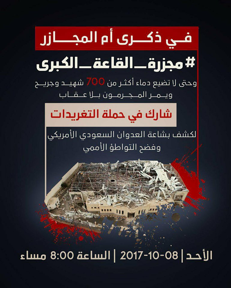 تنطلق مساء اليوم الأحد ، حملة تغريدات كُبرى على مواقع التواصل الاجتماعي في ذكرى مرور عام لارتكاب العدوان السعودي الأمريكي أكبر مجزرة في التاريخ الحديث على مستوى المنطقة ، حيث أغار طيرانه على عزاء لآل الرويشان في القاعة الكبرى بالعاصمة صنعاء موقعاً أكثر من 700 شهيد وجريح.