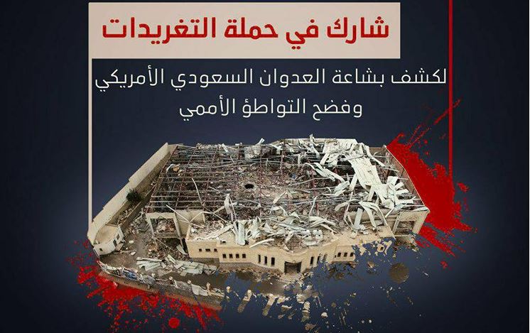 تنطلق مساء اليوم الأحد ، حملة تغريدات كُبرى على مواقع التواصل الاجتماعي في ذكرى مرور عام لارتكاب العدوان السعودي الأمريكي أكبر مجزرة في التاريخ الحديث على مستوى المنطقة ، حيث أغار طيرانه على عزاء لآل الرويشان في القاعة الكبرى بالعاصمة صنعاء موقعاً أكثر من 700 شهيد وجريح.