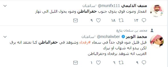 وقال مواطنين سعوديين من سكّان حفر الباطن في تغريدات على موقع “تويتر” أنهم سمعوا دوي انفجار عنيف هز المنطقة معرب اليوم الإثنين.