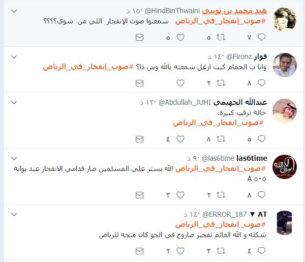 ورصد موقع “متابعات” عشرات التغريدات لسعوديين على “تويتر” بحسابات موثّقة بينهم الداعية الوهابي “عادل الكلباني” ، تحدّثوا عن سماع دوي انفجار عنيف شمال العاصمة الرياض.