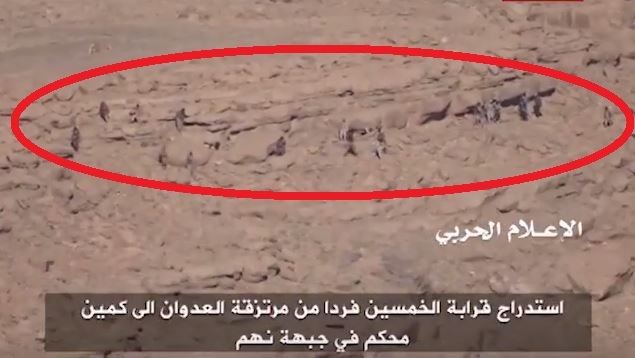 ويوضح المشهد خسائر المرتزقة في عملية استدراج نوعية لنحو 50 مرتزقا في منطقة الحول إلى موقع الكمين وتم استهدافهم بالأسلحة الخفيفة والمتوسطة ، أسفرت عن سقوط عدد من القتلى والجرحى في صفوفهم.