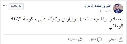 وفي منشور للإعلامي في قناة “الساحات” علي الزهري ، بصفحته على “فيسبوك ، قال أن مصادر رئاسية تحدّثت عن إجراء “تعديل وزاري وشيك على حكومة الإنقاذ الوطني”.