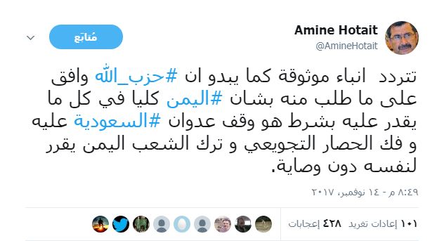 وتحدّث الضابط السابق في الجيش اللبناني أمين حطيط في تغريدة على حسابه بـ”تويتر” ، رصدها موقع “متابعات” عن تردد أنباء وصفها بـ”الموثوقة كما يبدو” ، أن “حزب الله وافق على ما طلب منه بشان اليمن كليا في كل ما يقدر عليه بشرط هو وقف عدوان السعودية عليه و فك الحصار التجويعي و ترك الشعب اليمن يقرر لنفسه دون وصاية.”