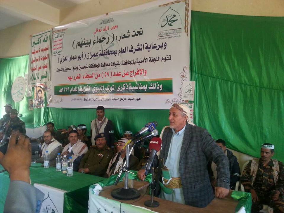 بمناسبه حلول ذكرى المولد النبوي الشريف وتحت شعار رحماء بينهم وجه قائد الثورة السيد عبد الملك بدرالدين الحوثي قيادة محافظة عمران بالإفراج عن 59 سجينا من نزلاء الاصلاحية المركزية بعمران من الذين تم القبض عليهم لارتباطهم بالعدوان وادوته.