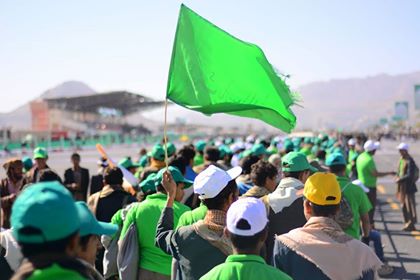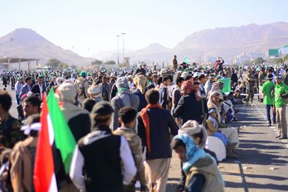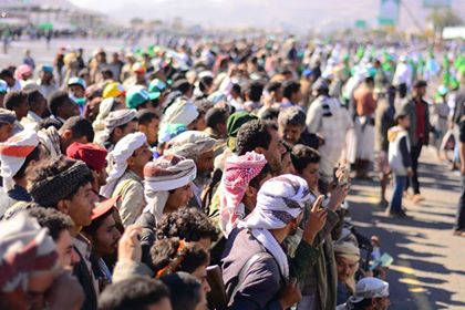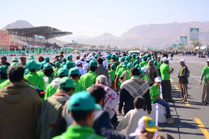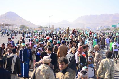 تتوافَدُ، منذ الصباح الباكر، الحشودُ الكبيرةُ القادمة إلى ساحة السبعين بالعاصمة صنعاء للمشاركة في فعالية المولد النبوي الشريف.