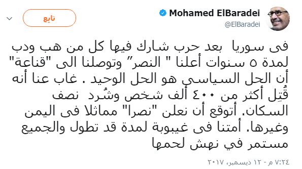 وقال البرادعي بتغريدة على حسابه عبر “تويتر”: “في سوريا بعد حرب شارك فيها كل من هب ودب لمدة 5 سنوات أعلنا (النصر) وتوصلنا إلى (قناعة) أن الحل السياسى هو الحل الوحيد”.