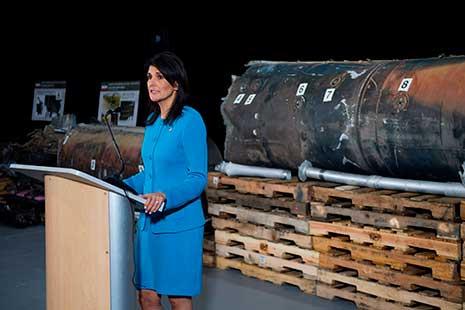 في خطوة غير مسبوقة، أحضرت المندوبة الأميركية في الأمم المتحدة، نيكي هيلي، حطام صاروخ إلى إحدى القواعد العسكرية قرب واشنطن، زاعمة أنه بقايا الصاروخ الذي استهدف العاصمة السعودية الرياض في الرابع من تشرين الثاني الماضي. ورأت هيلي، في مؤتمر صحافي خصصته لاتهام إيران بدعم حركة «أنصار الله» اليمنية، أن ما عرضته «أدلة دامغة» يكشفها البنتاغون وتؤكد «تورط» إيران في دعم الحركة، وأن الصاروخ الباليستي الذي استهدف الرياض صناعة إيرانية.