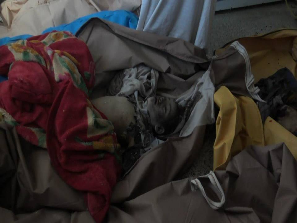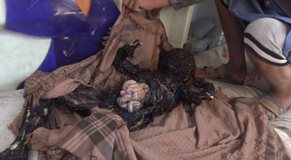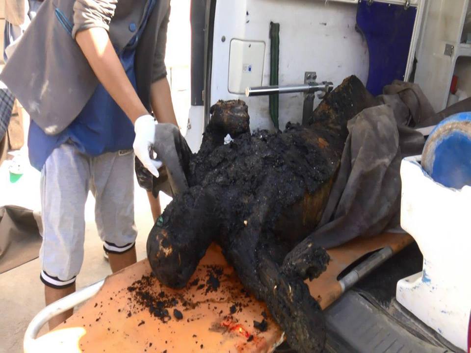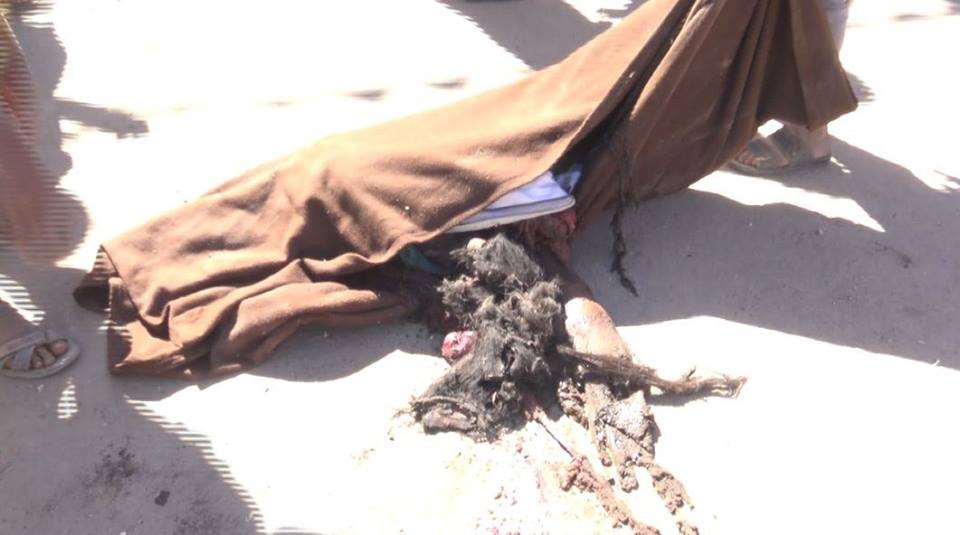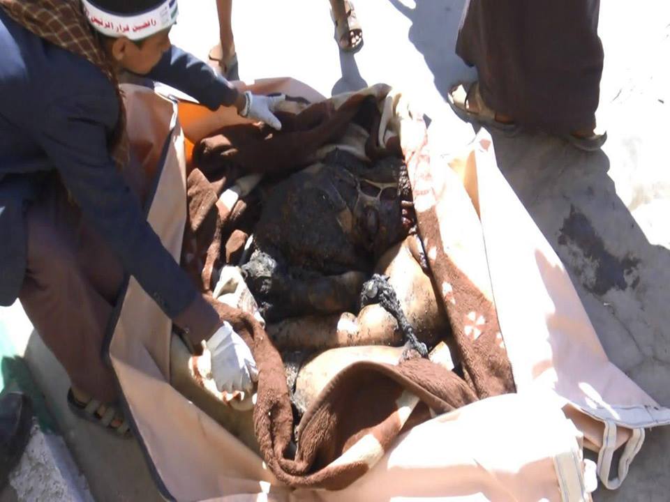 وتظهر الصور بشاعة الجريمة التي ارتكبها العدوان بحق المدنيين وسط مدينة صعدة وبالقرب من إحدى المدارس المكتظة بالطلاب في وقت الظهيرة.