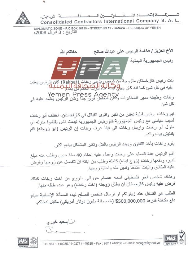 الوثيقة هي عبارة عن رسالة إلى الرئيس اليمني السابق ، تاريخها 3 إبريل 2008م ، من شخص يدعى سعيد خوري مؤسس شركة اتحاد المقاولين العالمية ، يطلب فيها من علي عبدالله صالح التدخل عند زيارة كازاخستان في منع حدوث انفصال ابنة الرئيس من زوجها ، أو إرسال شخص للصلح في هذه المسألة الإنسانية وسيتم دفع مكافأة قدرها 500 مليون دولار مقابل التدخل.