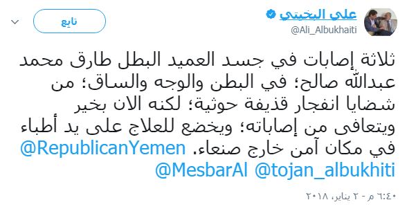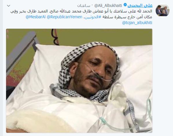 وقال البخيتي أن طارق صالح تعرّض لثلاث إصابات في البطن والوجه والساق؛ من شظايا انفجار قذيفة “حوثية” ؛ لكنه الان حسب زعمه “بخير ويتعافى من إصاباته؛ ويخضع للعلاج على يد أطباء في مكان آمن خارج صنعاء.”