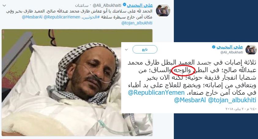وقال البخيتي أن طارق صالح تعرّض لثلاث إصابات في البطن والوجه والساق؛ من شظايا انفجار قذيفة “حوثية” ؛ لكنه الان حسب زعمه “بخير ويتعافى من إصاباته؛ ويخضع للعلاج على يد أطباء في مكان آمن خارج صنعاء.”