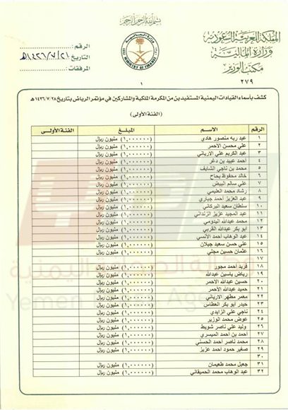 الوثيقة التي تنشرها وكالة الصحافة اليمنية الليلة تكشف جانبا بسيطا من السخاء السعودي مع قادة سياسيين واجتماعيين يمنيين دأبوا على المتاجرة بالحروب واصطناع الازمات الداخلية لتعزيز شعبيتهم ونفوذهم على رقاب ومصير اليمنيين خدمة للنظام السعودي.