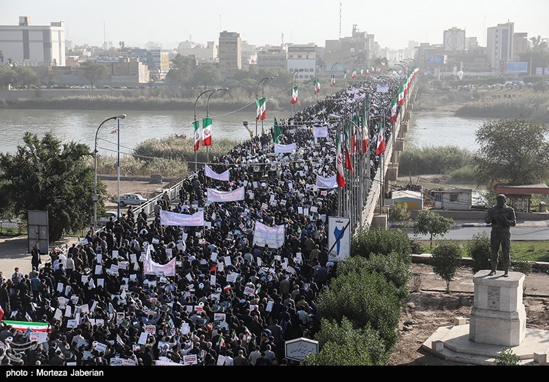 وفي الأهواز نزل أهالي المدينة الأغيار الى الشوارع منددين بالتعرض للمقدسات ورموز إيران الإسلامية المقدسة وأعربوا عن تمسكهم بالوحدة في مواجهة المخربين المدعومين أجنبيًّا. المتظاهرون رفعوا الشعارات الثورية وأكّدوا في الوقت نفسه على ضرورة اتخاذ الحكومة الإجراءات الاقتصادية المناسبة لتخفيف المعاناة عن الشعب.