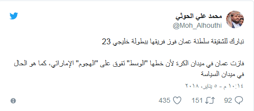 وقال الحوثي في تغريدة على “تويتر”، أن المنتخب العماني لكرة القدم فاز في ميدان الكرة لأن خطها “الوسط” تفوق على “الهجوم” الإماراتي، كما هو الحال في ميدان السياسة.