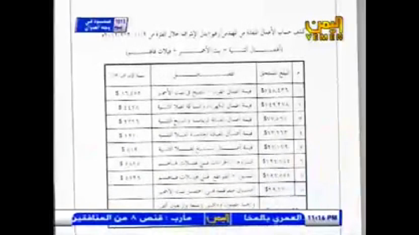 بثت قناة اليمن الفضائية أمس الجمعة في برنامجها “بصراحة” الذي يقدمه الإعلامي عبدالرحمن العابد، وثائق عن الأموال الطائلة التي أنفقها زعيم المليشيات العفاشية الصريع علي عبدالله صالح، ونجله أحمد خلال توليه السلطة.