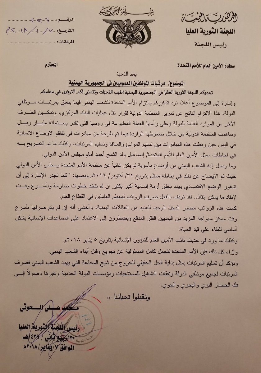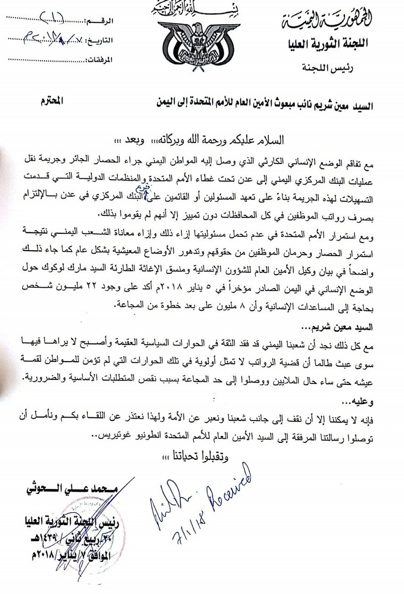 نشر رئيس اللجنة الثورية العليا محمد علي الحوثي على حسابه بـ”تويتر” صور لرسالتين بعث إحداهما لأمين عام الأمم المتحدة والأخرى لنائب المبعوث الأممي.