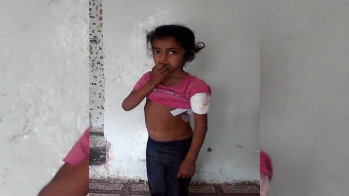 وتعرضت الطفلة لإصابة بالذراع ناجمة عن قنصها من قبل مرتزقة العدوان، بصورة تجسد بشاعة وإجرام مرتزقة العدوان بحق الطفولة.