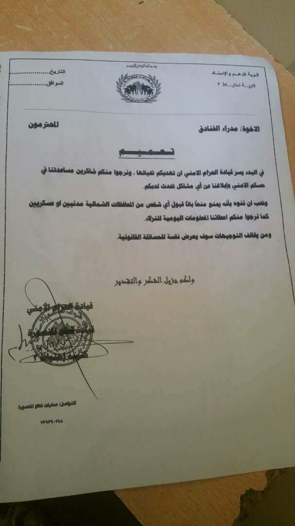 كما طلبت من مدراء الفنادق تزويدها بمعلومات يومية عن النزلاء.