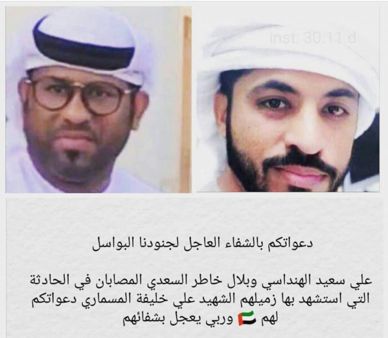 كما نشر نشطاء إماراتيون أسماء جنديين قالوا إنهم تعرضوا للإصابة في الحادثة التي قتل بها زميلهم المسماري في اليمن، مشيرين إلى أن الجرحى هما علي سعيد الهنداسي وبلال خاطر السعدي.