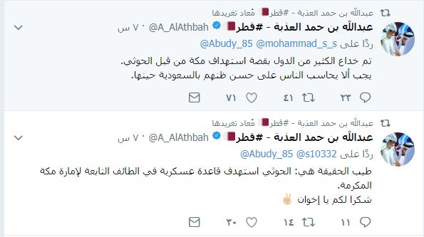 في سلسلة ردود على بعض المغردين في حسابه على “تويتر” حول مزاعم استهداف القوة الصاروخية اليمنية لمكة المكرمة التي ظل تحالف العدوان السعودي الأمريكي يروج لها منذ عدة أشهر ، أكد الكاتب القطري ورئيس تحرير صحيفة العرب عبدالله العذبة أنه “تم خداع الكثير من الدول بقصة استهداف مكة من قبل الحوثي.”