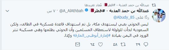 وقال أن “الحوثي بغبي ليستهدف مكة، بل تم استهداف قاعدة عسكرية في الطائف، ولكن السعودية لجأت للولولة لاستعطاف المسلمين وأن الحوثي يظلمها وهي مسكينة تنثر الورود في اليمن بقيادة #إمارة_أبوظبي_المارقة وكِذا.”