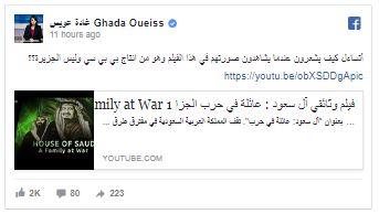 وقالت “عويس” في تدوينة لها عبر حسابها بموقع التواصل الاجتماعي “فيسبوك” مرفقة به جزءا من الفيلم الوثائقي المكون من ثلاثة أجزاء فضحت عهر “آل سعود” وفسادهم وكيف عملوا على تشجيع التطرف على مستوى العالم: “أتساءل كيف يشعرون عندما يشاهدون صورتهم في هذا الفيلم؟”.”