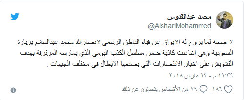 وأكد محمد عبدالقدوس نائب رئيس مجلس إدارة وكالة الأنباء اليمنية سبأ ، في تغريدة على حسابه بـ”تويتر” ، أن “لا صحة لما يروج له الابواق عن قيام الناطق الرسمي لانصارالله محمد عبدالسلام بزيارة السعودية”.