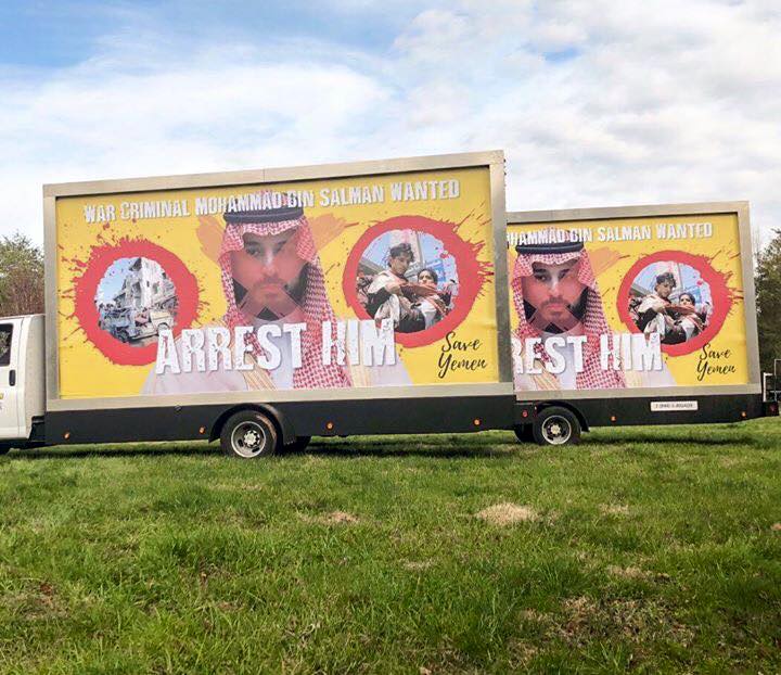تناقلت المواقع الإخبارية صورة لسيارات ضخمة تجوب شوارع واشنطن تطالب بالقبض على محمد بن سلمان كقاتل لاطفال اليمن، وكمجرم حرب يقتل ويدمر الشعب اليمني .