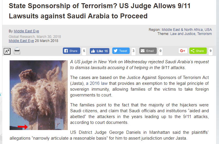 فبحسب ما نقل موقع غلوبال ريسيرش الكندي رفض قاض أمريكي في نيويورك طلب السعودية رفض دعاوى قضائية تدينها بالمساعدة في هجمات 11 سبتمبر.