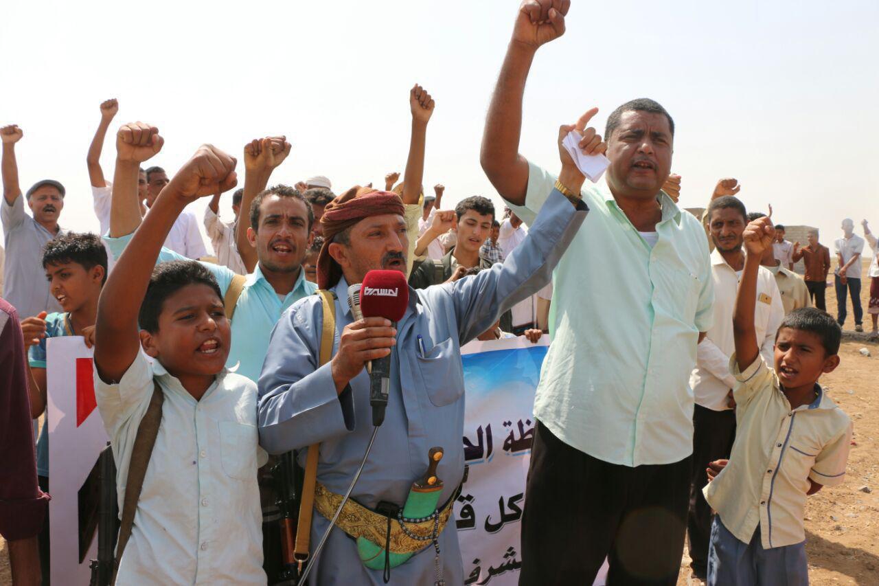 وعبر المشاركون في الوقفة الاحتجاجية عن استنكارهم الشديد لأغتصاب فتاة مديرية الخوخة فتاة كل اسرة تهامة ويمنية وقتل النازحين العزل ولما يرتكبة العدوان السعودي الامريكي من جرائم وحرب عبثية ناقمة ضد بلادنا وحصار جائر استهدف كل مقومات الحياة