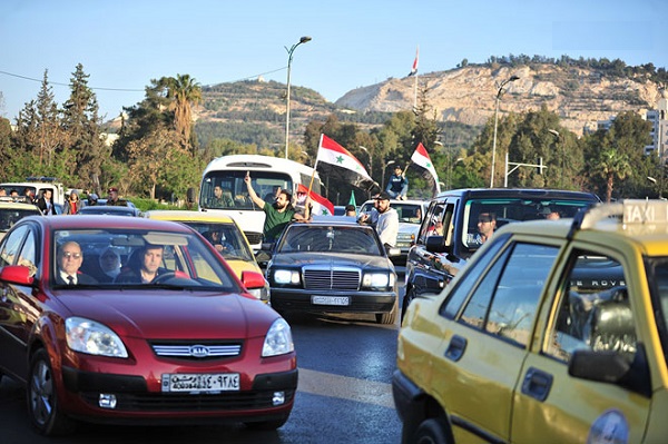 كما خرجت سيارات قرب ساحة الأمويين وسط دمشق وتجولت على أنغام الأغاني الوطنية تعبيراً عن رفضهم للقصف الذي تتعرض له سوريا، مؤكداً أن دمشق لا تزال تعيش حياتها والكهرباء لم تنقطع والشوارع منارة.
