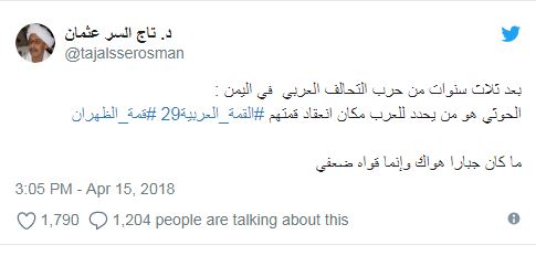 ودون “عثمان” في تغريدة له عبر صفحته الشخصية بتويتر ساخرا من ضعف قادة العرب أمام القوت اليمنية: “بعد ثلاث سنوات من حرب التحالف العربي في اليمن: الحوثي هو من يحدد للعرب مكان انعقاد قمتهم، القمة العربية، قمة الظهران… ما كان جبارا هواك وإنما قواه ضعفي”.