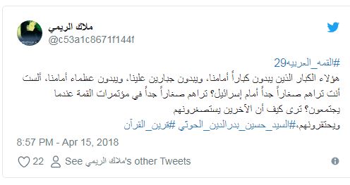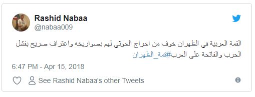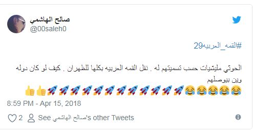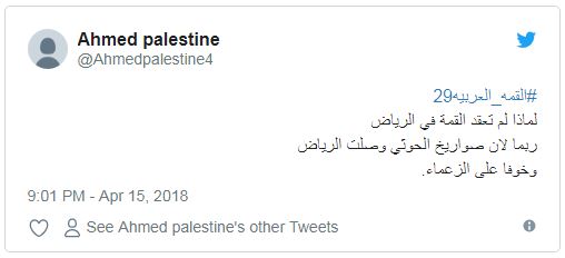 وتصدر “الحوثي” هاشتاغات القمة العربية، وبدل من أن تتحدث تغريدات النشطاء عن مواضيع القمة والشأن العربي، دارت معظم الأحاديث عن رعب زعماء العرب من الصواريخ اليمنية التي أجبرتهم على عقد قمتهم بـ”الظهران” بدلا من الرياض.