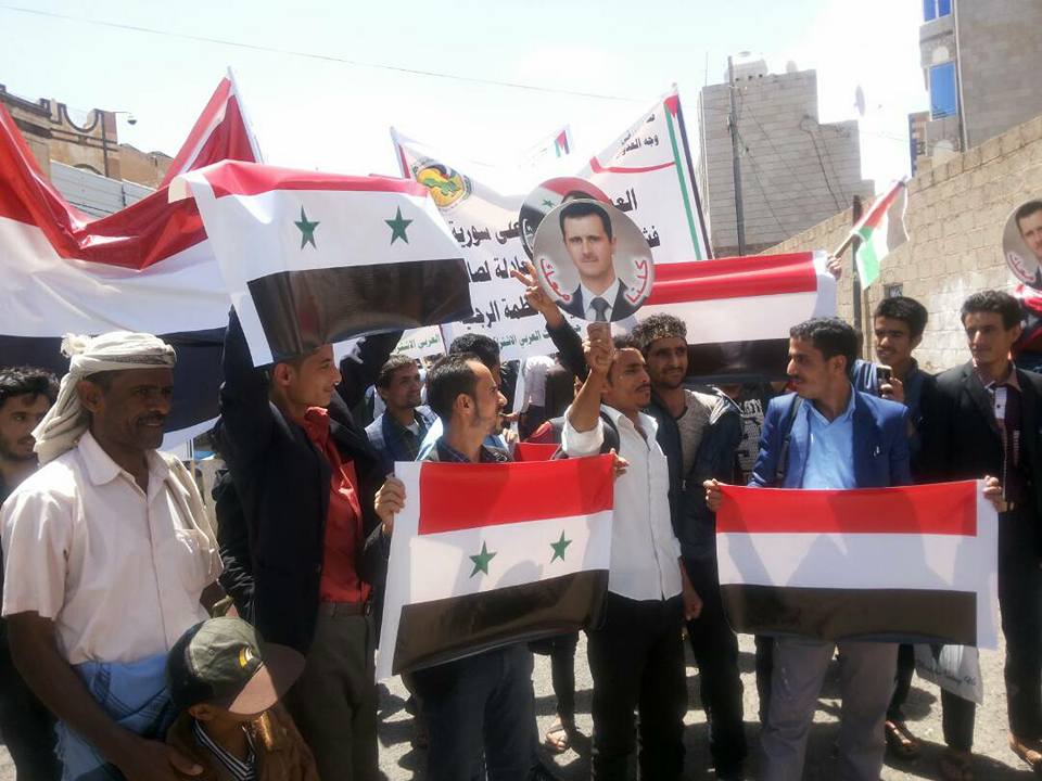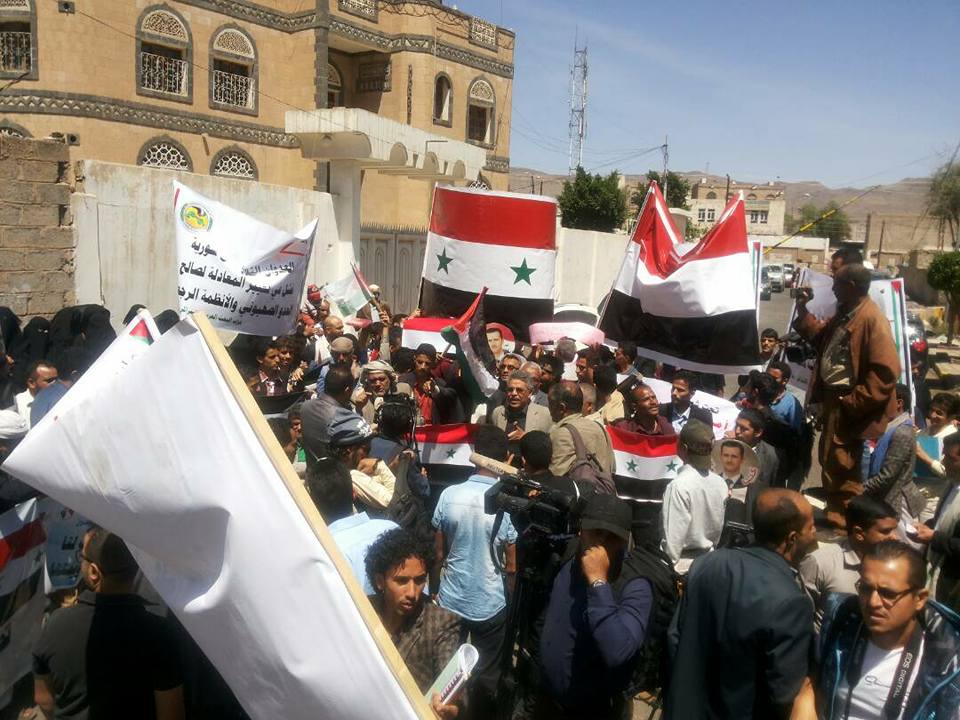 استنكرت الجماهير اليمنية التي خرجت اليوم امام السفارة السورية بصنعاء الصمت العربي المغزي تجاه العدوان الثلاثي الأمريكي البريطاني الفرنسي الصهيوني الحاقد على شعب سوريا والامة العربية