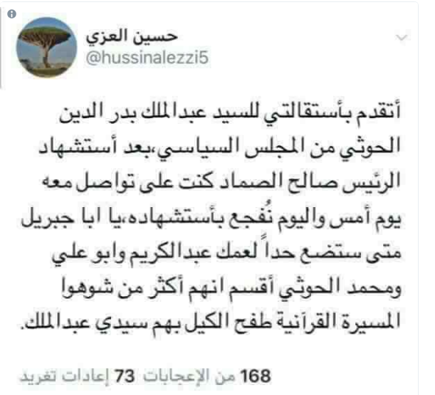 نفى القيادي في حركة أنصار الله ونائب وزير الخارجية اليمني حسين العزي، ما تداولته وسائل إعلامية تابعة لتحالف العدوان بشأن استقالته، مستندة على تغريدة لحساب مزور باسمه في موقع التواصل الاجتماعي “تويتر”.