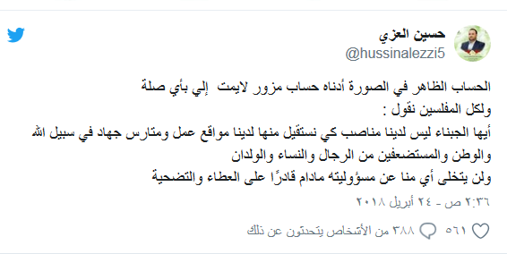وأوضح العزي في تغريده على حسابه بـ”تويتر” أن “الحساب الظاهر في الصورة أدناه حساب مزور لايمت إلي بأي صلة”.