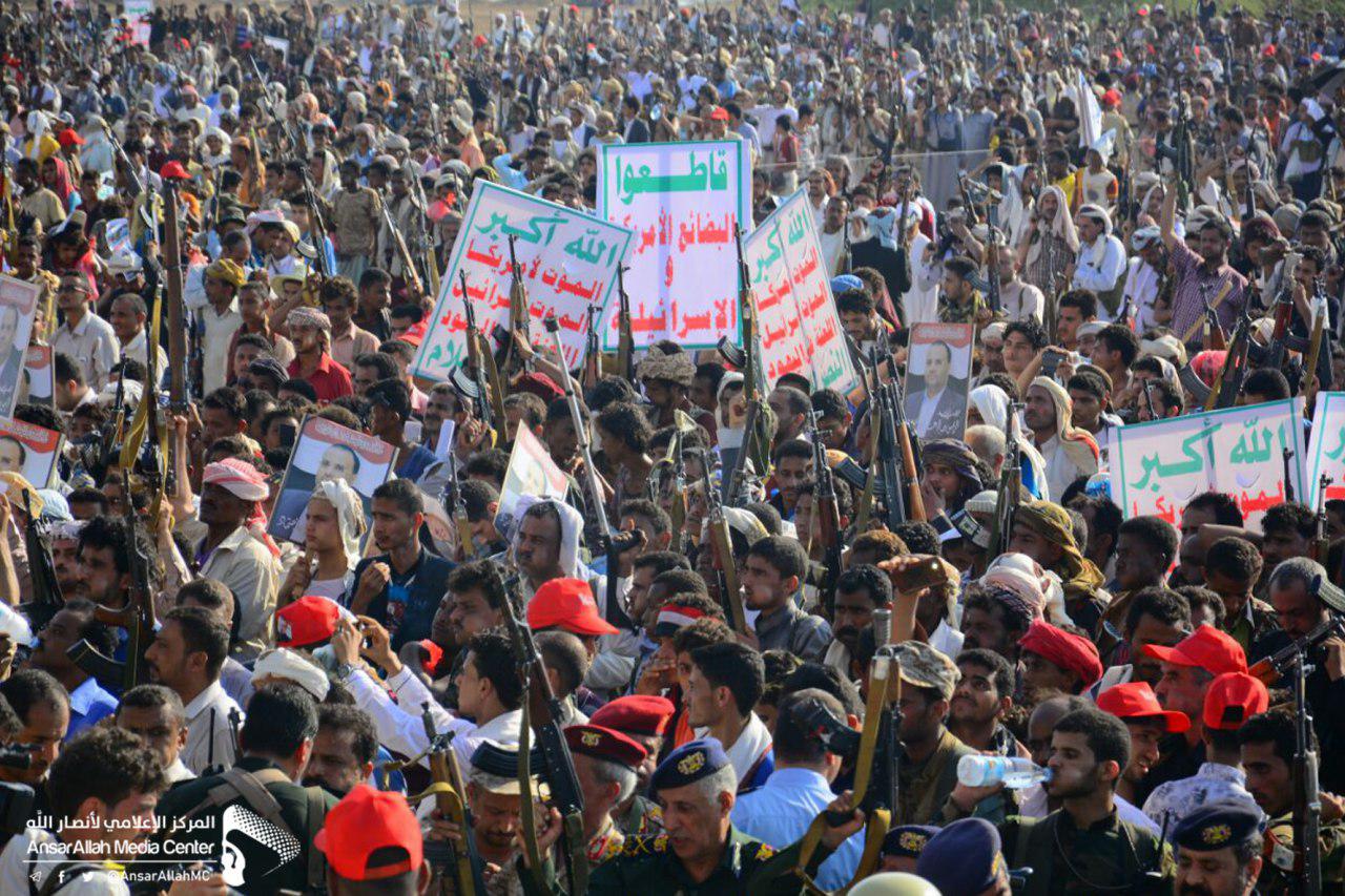 ورفع المشاركون بنادقهم مرددين شعارات منددة بجرائم تحالف العدوان وجريمة استهداف الرئيس صالح الصماد ، كما أكدوا جاهزيتهم لأي مواجهة يفكر بها العدوان في محافظة الحديدة.