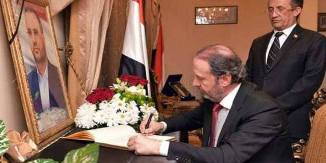 قدم وزير شؤون رئاسة الجمهورية في سوريا منصور عزام اليوم الإثنين التعازي لسفير اليمن بدمشق نايف القانص باستشهاد رئيس المجلس السياسي الأعلى الرئيس الشهيد صالح الصماد الذي اغتاله العدوان السعودي بثلاث غارات جوية قبل أيام.