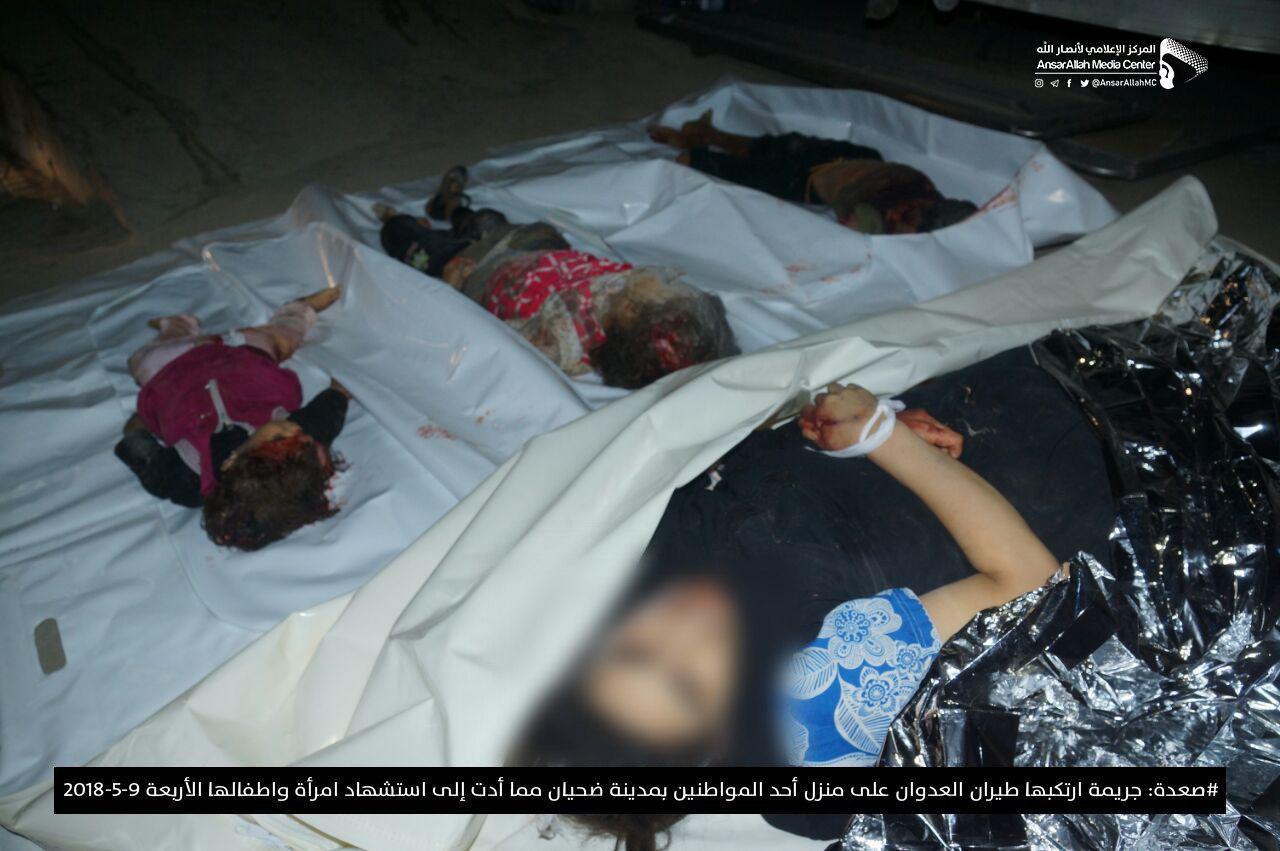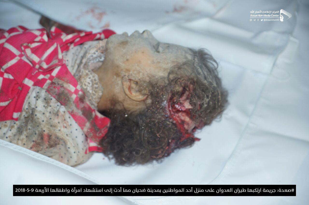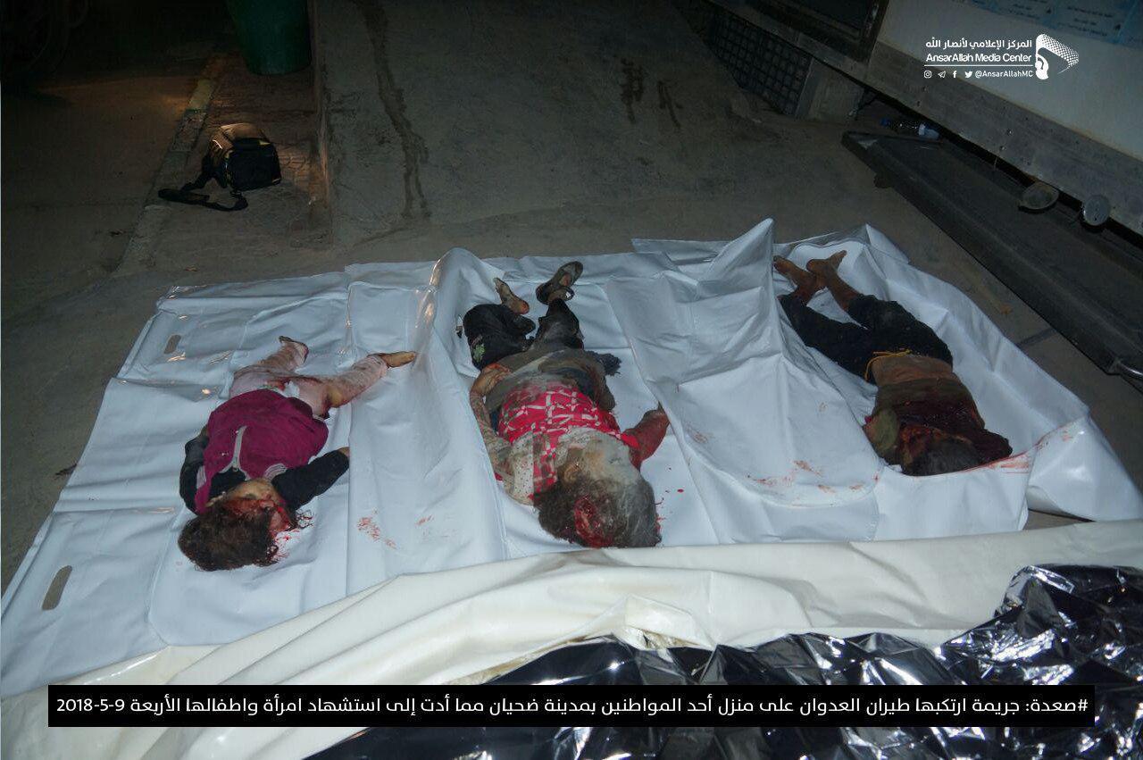 وأفاد مصدر محلي، عن استشهاد امرأة وأولادها الاربعة بغارة لطيران العدوان استهدفت منزل أسرة المواطن محمد عبدالعظيم اللبلوب في مدينة ضحيان بمديرية مجز.