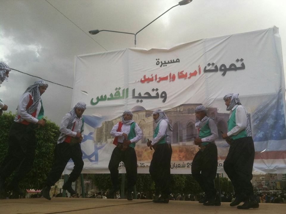 وتقاطرت جموع الحشود الغاضبة إلى ساحة باب اليمن وفاءً للقدس وفلسطين ورفضاً لتهويد القدس وقرارات الإدارة الأمريكية بنقل السفارة الأمريكية إليها، وتأكيداً على عروبية القدس وفلسطين.