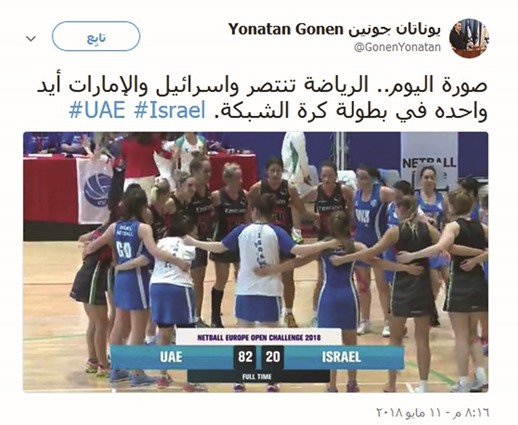 واحتفى مسؤول الدبلوماسية الرقمية بالعربية في وزارة الخارجية الإسرائيلية، يوناتا جونين، على صفحته في «تويتر»، بالمباراة، قائلاً: «صورة اليوم.. الرياضة تنتصر، وإسرائيل والإمارات يد واحدة في بطولة كرة الشبكة».