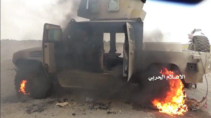 ووثقت عدسة الإعلام الحربي لحظة استهداف آلية عسكرية للمرتزقة بصاروخ موجه كانت تحمل معد عيار 14.5 ما أدى إلى تدميرها.