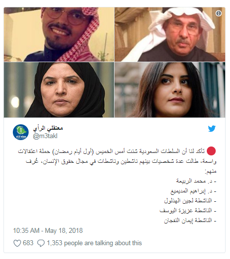 ونشر موقع “معتقلي الرأي” السعودي المعارض على موقع التواصل الاجتماعي تويتر صوراً لعدد من المعتقلين، قائلاً: تأكد لنا أن السلطات السعودية قد شنت أول أيام رمضان حملة اعتقالات واسعة، طالت عدة شخصيات بينهم ناشطون وناشطات في مجال حقوق الإنسان، عُرف منهم: