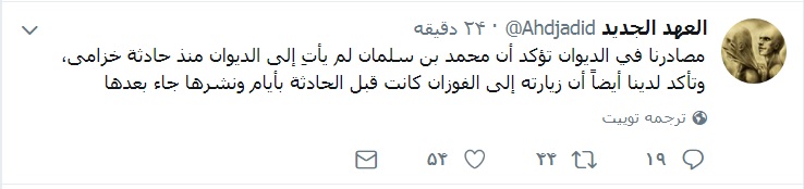 غرد حساب “العهد الجديد” علی تویتر نقلا عن مصادره بأن ولي العهد السعودي لم يتواجد في الديوان الملكي منذ حادثة حي “الخزامي”.