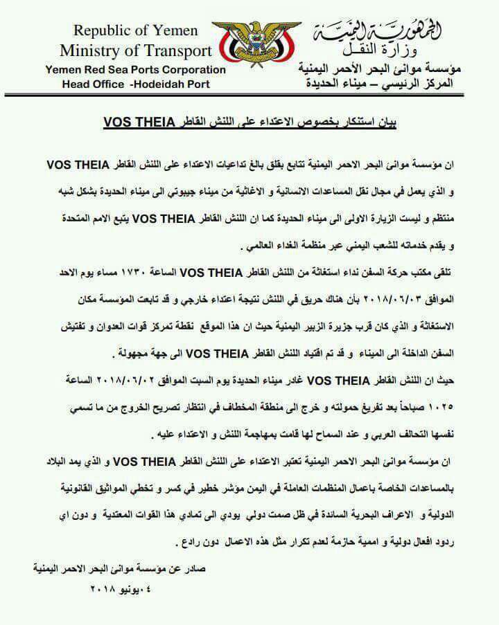 واعتبرت المؤسسة في بيان أن الاعتداء على اللنش القاطر VOS THEIA والذي يمد البلاد بالمساعدات الخاصة بالمنظمات العاملة في اليمن، مؤشر خطير وانتهاك للمواثيق والقوانين الدولية والأعراف البحرية.