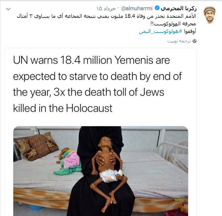 وقال “المحرمي” في تدوينة له عبر حسابه بموقع التدوين المصغر”تويتر”: الأمم المتحدة تحذر من وفاة 18.4 مليون يمني نتيجة المجاعة أي ما يساوي 3 أمثال محرقة الهولوكوست.